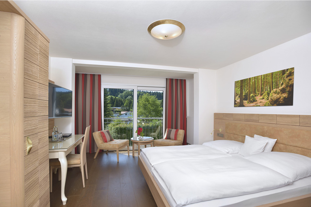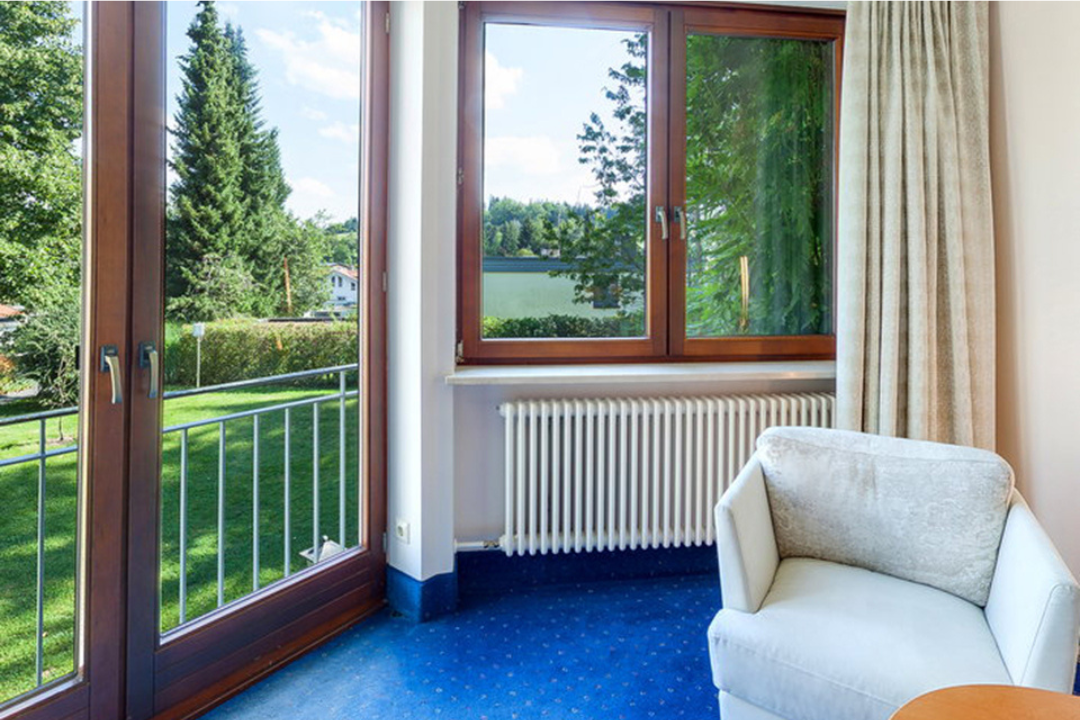 Unsere großzügigen Zimmer nach Süden bieten viel Licht und eine warme Wohnatmosphäre. Hochwertige Holzmöbel sorgen für Gemütlichkeit und Stil. Vom französischen Balkon genießen Sie den Ausblick in den Garten.
